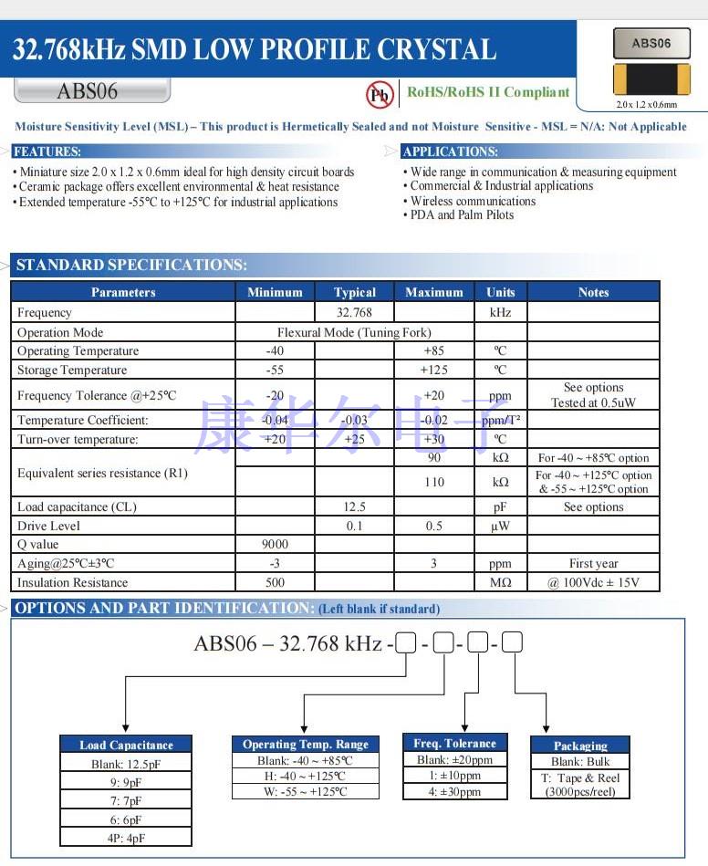 Abracon无源晶振中物料编码为ABS06-32.768KHZ-6-T的ABS06石英晶体,该晶振的频率是32.768KHz,精度为±20ppm,负载电容是6pF,其工作温度在-40°C~85°C,尺寸是2.00mmx1.20mm,为2012贴片晶振。该晶振也叫美国进口晶振、石英晶体,艾博康石英晶振,两脚SMD晶振,通信和测量设备晶振,无线通信晶振,多应用在商业和工业应用上比较多,符合RoHS/RoHS II标准。美国艾博康晶振32.768KHZ系列,在当今全球晶振市场说的上是质优价廉,产品本身外观是多种化,体积有大有小,有二个脚SMD焊接模式,也有三个脚SMD焊接模式,一样有四个脚焊接模式,还有时钟模块焊接模式,产品具有无源32.768KHZ,也有带电压模式的32.768KHZ晶体系列,产品应用范围非常广阔。